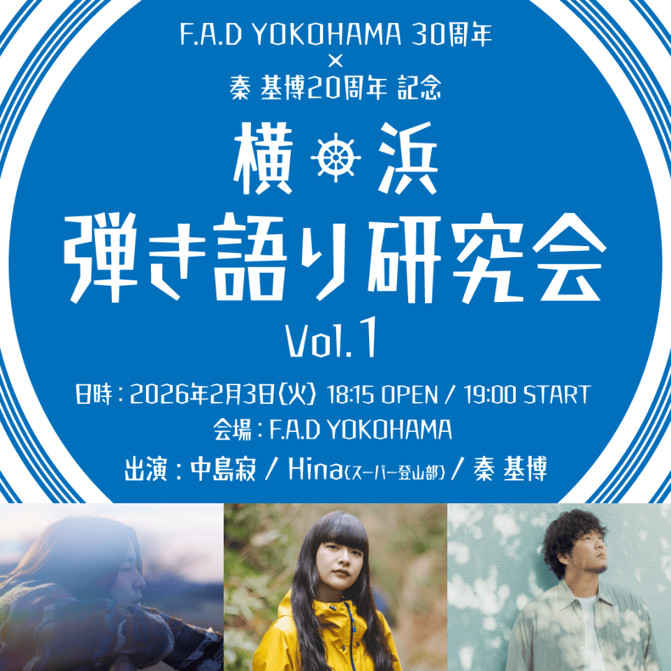 2026年にデビュー20周年を迎える秦 基博と、同じく2026年に設立30周年を迎える秦の出身ライブハウスであるF.A.D YOKOHAMAが企画する、弾き語りライブ「横浜弾き語り研究会 Vol.1」の開催が決定しました!