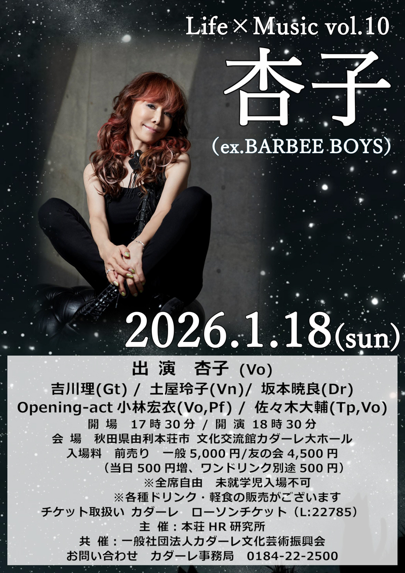 1/18「Life×Music vol.10」(秋田県・カダーレ)に杏子出演決定! 【NEW】