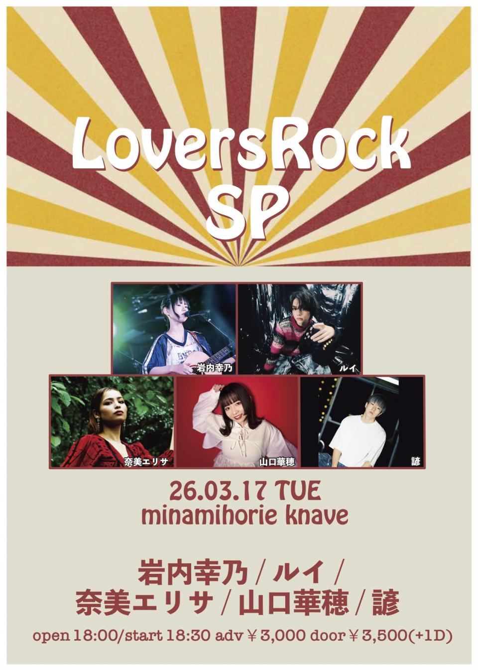 2026.1.29(THU) 3.17(火) 「LoversRock SP」に出演決定!! 3.17(火) 「LoversRock SP」に出演決定!! OPEN/START 18:00/18:30 チケット:前¥3,000 当¥3,500(+1D) 出演:奈美エリサ/諺/岩内幸乃/山口華穂/ルイ WEB: http://www.knave.co.jp