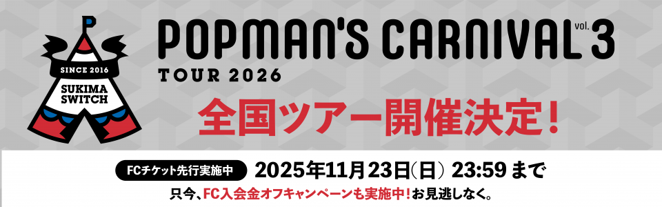 ヒット曲、定番曲はもちろん、あまりライブで演奏されなかったレアな曲など、これまでのキャリアの中から幅広くセレクトされた楽曲を存分にアレンジしながら披露していく“POPMAN’S CARNIVAL”の3度目の全国ツアーが決定!!