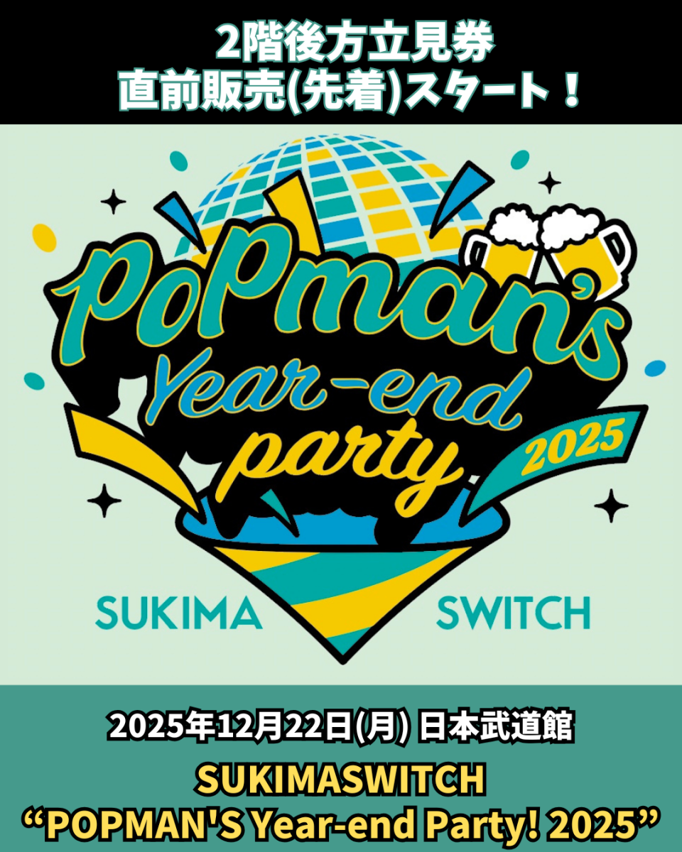 大好評につき完売となっていた12月22日(月)開催『スキマスイッチ “POPMAN'S Year-end Party! 2025”』公演つきまして、2階後方立見券を直前販売(先着受付)することが決定しました!