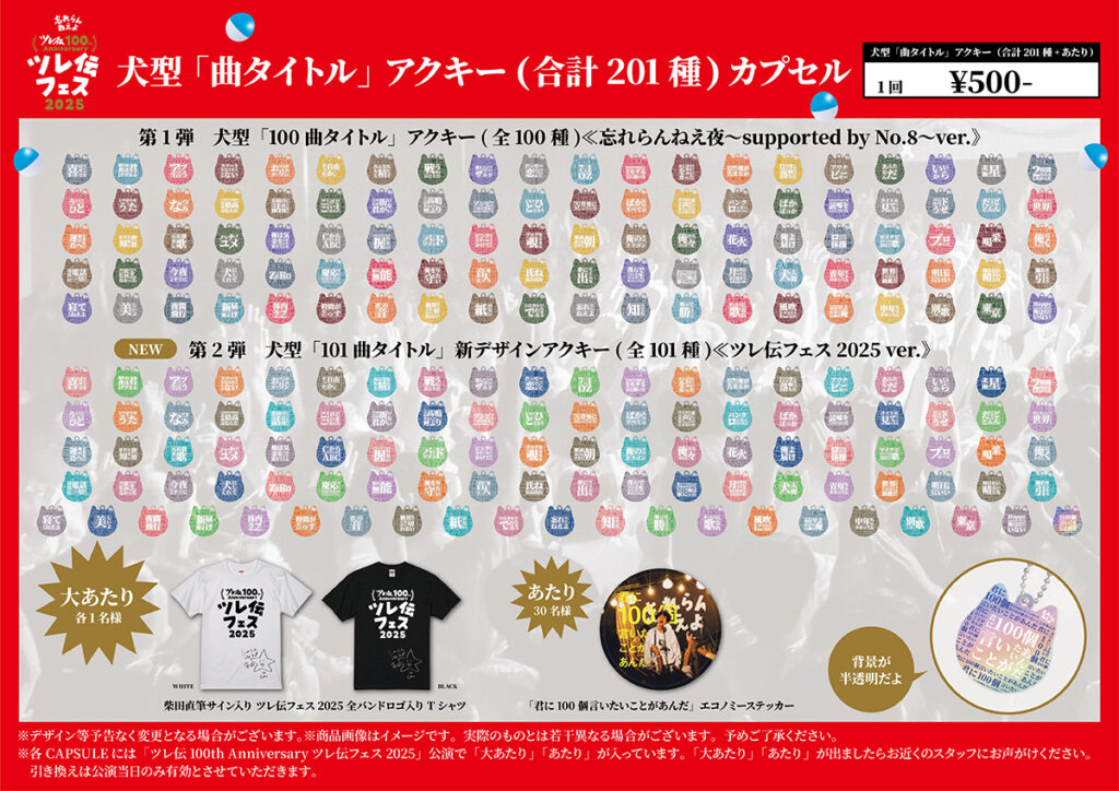 さらに当日会場内で『ツレ伝フェス2025』犬型「曲タイトル」アクキー(全201種)の販売が決定!