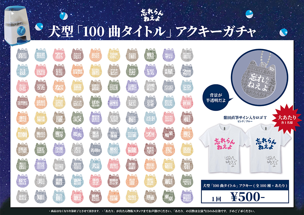 ※犬型「100曲タイトル」アクキー(全100種)には「忘れらんねえ夜~supported by No.8~」公演で「あたり」が入っています。「あたり」の引き換えは公演当日のみ有効とさせていただきます。