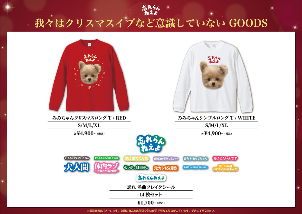 今年のクリスマスを彩るアイテムとしてホワイト・レッドの2種デザインで制作された愛犬・みみちゃんのロングTシャツ。また『ツレ伝フェス2025』で大好評だった、忘れらんねえよの名曲をデザインしたフレイクシールの第2弾が登場。