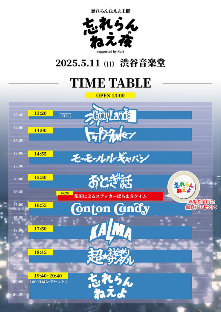 5/11(日)タイムテーブル解禁!!「忘れらんねえ夜〜supported by No.8〜」